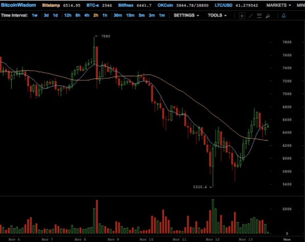11月比特币上演了过山车行情。在芝商所10月31日宣布推出比特币期货后,比特币连破纪录,在11月8日刷破新高至7888美元。不过比特币却在上周五一路俯冲,价格一度从11月8日的7888美元下挫到周日的5555.6美元,跌幅达30%。据Bitstamp数据显示,今日比特币较周日的两周半低位大幅反弹1000美元,12个小时涨幅达15%。比特币现在交投于6500美元附近。
