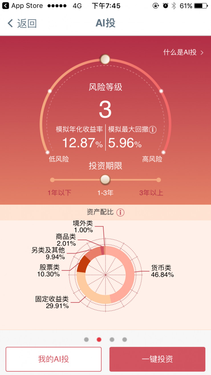 进入到具体操作页面,设定好风险等级和投资期限以后,“AI投”计算显示出这样的投资偏好下的模拟年化收益率及模拟最大回撤;而在页面的下端,“AI投”以饼图形式展示出其设计推荐给用户的资产配比,可见最大头为约占一半的“货币类”,紧随其后的是占比约30%的“固定收益类”,还有“股票类”“境外类”等等共同组成该智能投顾产品的投资组合。