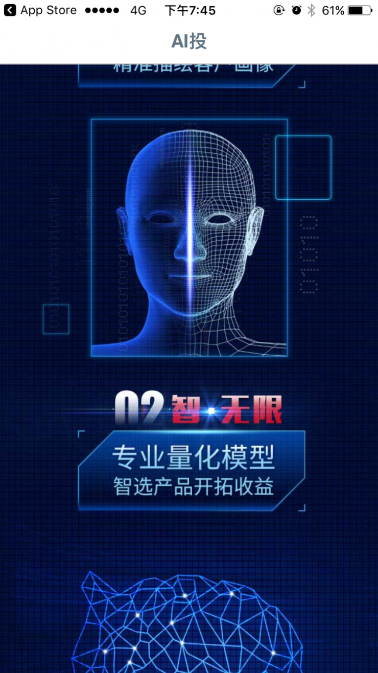 点击进入,首先在宣传页面,“AI投”在用户画像上称,其基于海量数据能够实现对客户画像的精准描绘;而关于投资产品设计,其亦显示,使用了专业量化模型来实现“智选产品开拓收益”,而关于风控,“AI投”则称涵盖了六类基金从而控制分散投资风险。