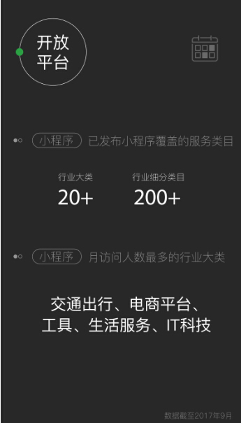 微信小程序已覆盖20多个行业大类、200多个行业细分项目,月访问人数最多的是交通出行、电商平台、工具、生活服务、IT科技。