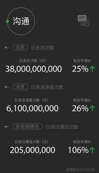 朋友圈每天都有6800万个视频发出,年增22%,十一期间朋友圈签到最远的是格陵兰岛。