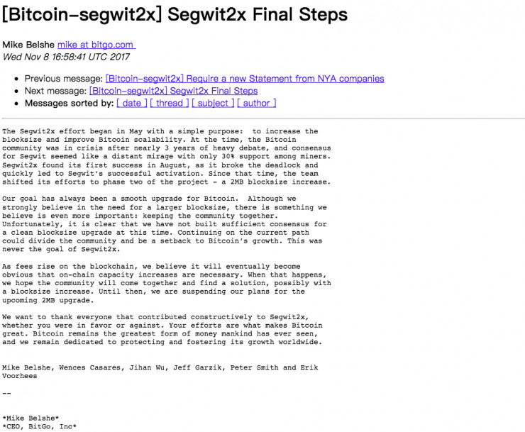 网络整理 2021-03-22 19:13北京时间11月9日凌晨,SegWit2x项目主要开发者之一、比特币交易平台BitGo的CEOMike Belshe在一封邮件中表示,出于“维护比特币社区团结”(keeping the community together)的考虑,SegWit2x项目组织方将“叫停”搁置该项目的实施,直至整个社区能达成共识,共同找到关于比特币扩容的解决方案。