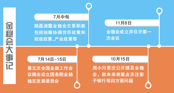 监管方面透露的信息却一直相对有限。今年7月14日-15日,第五次全国金融工作会议提出设立国务院金融稳定发展委员会,其办公室设在央行。不过直到一个月前,央行行长周小川才在一次公开活动中首次提及金稳会,称未来金稳会将重点关注四方面问题,分别是影子银行、资产管理行业、互联网金融和金融控股公司。