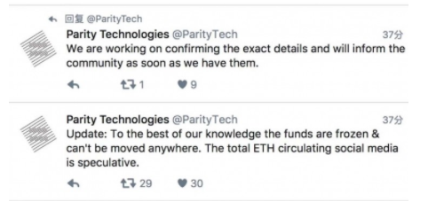 而在四月前,Parity已经因为安全漏洞造成过以太币损失。7月19日,Parity发布安全警报,警告其钱包软件1.5版本及之后的版本存在一个漏洞。据该公司的报告,确认有150,000ETH(大约价值3000万美元)被盗。据Parity所说,漏洞是由一种叫做wallet.sol的多重签名合约出现bug导致。后来,白帽黑客找回了大约377,000受影响的ETH。