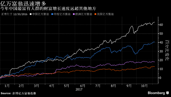 彭博亿万富翁指数显示,中国今年新添八名亿万富翁,最富有人群的财富增长快于其他任何地方。该指数是对全球富豪榜前500强进行的每日排名,中国有38位亿万富翁榜上有名,他们的财富在2017年增长67%,合计达到4610亿美元。