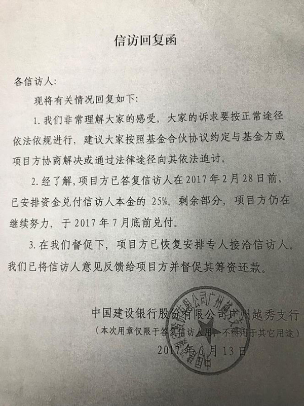 建设银行越秀支行的一位高管每次都会接待赵李涓等人。在一封落款时间为2017年6月13日的回复函中,建设银行越秀支行承诺,项目方(君麟公司)已答复在2017年2月28日前,已安排资金兑付投资人本金的25%。剩余部分,项目方仍在继续努力,于2017年7月底前兑付。