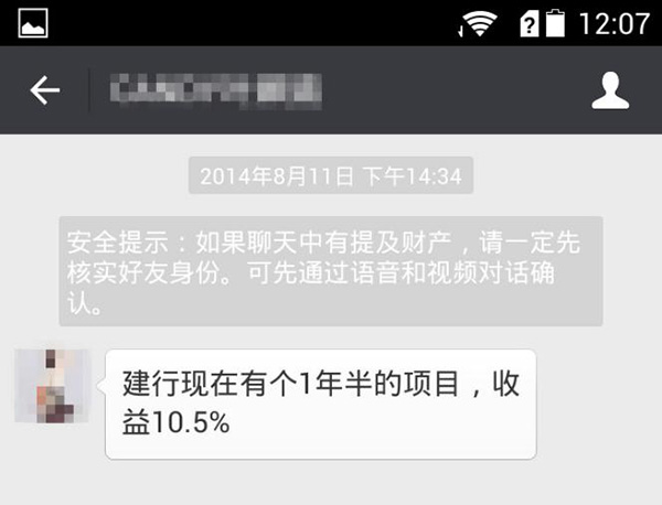 2014年8月,与王桂芬认识但打交道不算多的陈娟找到了王桂芬,甚至找到了她家里,反复推销这款所谓“建行兜底”的理财产品。陈娟所在的建设银行五羊新城支行就在王桂芬家楼下,王桂芬过去不时在这家银行网点买理财产品。陈娟曾在微信里告诉王桂芬,这是建行的项目,年化收益10.5%。在王桂芬看来,相比以往买过的国债,这款产品的收益要高出好几个百分点。
