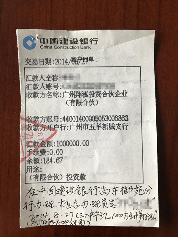赵李涓转账的过程更为平静与“正常”。就像之前买理财产品一样,她并没有过多在意,在建设银行中山二路支行柜台转完账,拿着转账凭条就走了。按以往的经验,客户经理会在之后把产品说明书给她,还一并签合同。