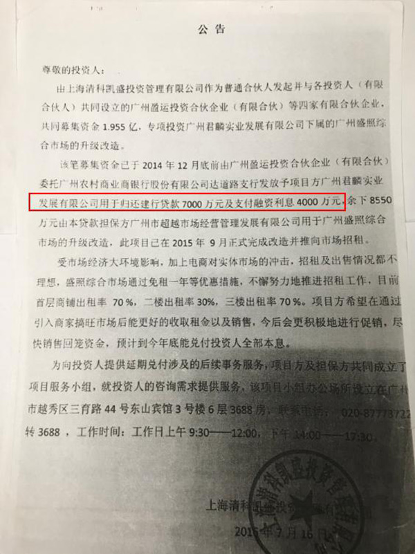 一则上海清科在2016年7月份发给投资人的公告显示,4家投资合伙企业所募集的1.955亿元中,有7000万元用于归还建设银行贷款、4000万元支付融资利息,剩余的8550万元则用于旧货市场的升级改造。