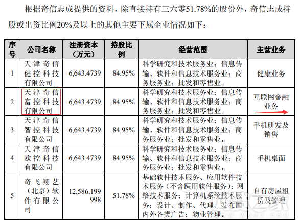 根据报告书内容,由360董事长周鸿祎控制的奇信志成(作为此次资产置入方排名首位的公司)主要下属企业中,天津奇信富控科技有限公司(下文简称“奇信富控”)主营业务为“互联网金融业务”(如上截图),公司法人为周鸿祎。