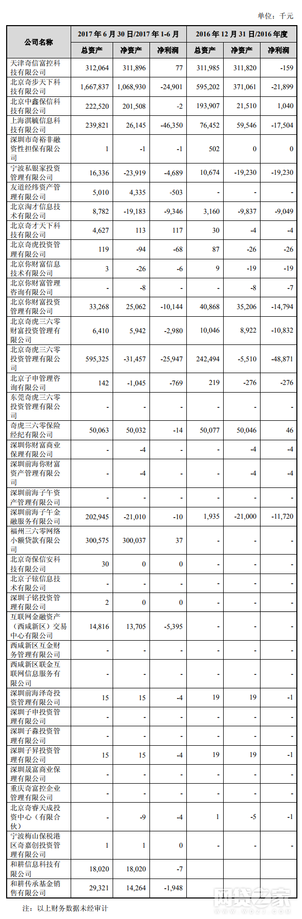 报告书还披露了360集团旗下39家互金公司(含奇信富控)今年上半年以及2016年的财务数据。网贷之家注意到,截至今年上半年,除了互金业务母公司奇信富控、北京奇才天下科技有限公司(360贷款导航)、福州三六零网络小额贷款有限公司三家公司盈利之外,其余公司均为亏损或未有财务数据。