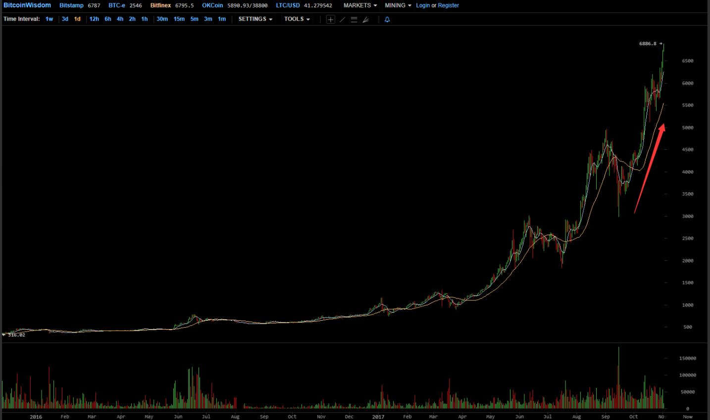网络整理 2021-03-22 19:19昨日冲上6600美元后,11月2日周四,比特币继续飙涨,首次突破6800美元。