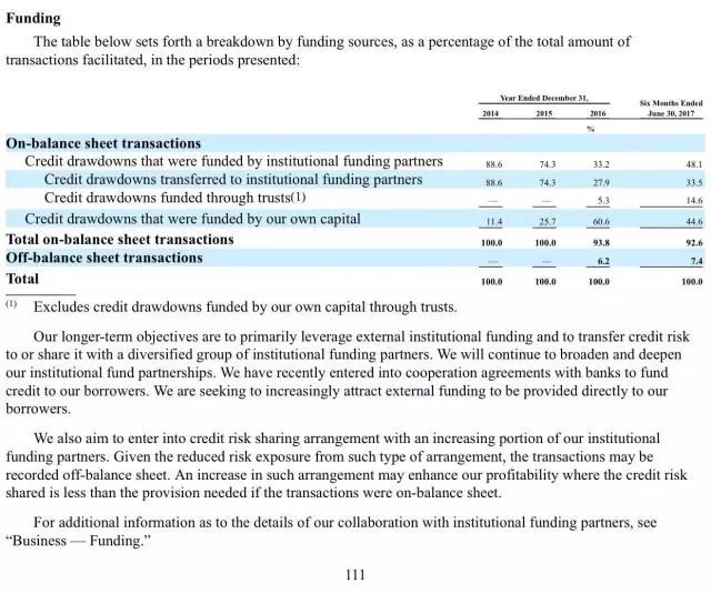 招股书的另一个数据显示,截止到2016年底及2017年6月30日,趣店转让给P2P平台的信贷额度分别为人民币80.99亿元(1.197亿美元)和2.751亿元人民币(约合4060万美元),分别在当期机构资金交易总额占比达到63.7%和1.3%,而到了2017年4月,趣店已经停止向P2P平台转移信贷额度。