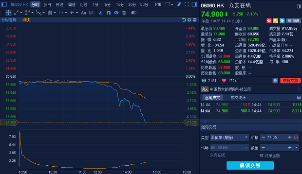 众安在线(6060 HK)一度下跌逾7%,创10月4日以来低位74.9港元;目前跌幅缩小为4.6%。