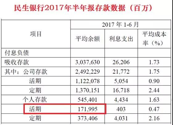 浦发银行和民生银行的个人活期存款更少一些,2017年6月30日的浦发银行个人活期存款余额为1876亿元,民生银行没有披露2017年6月30日当天的存款余额,只披露了2017年1月到6月的个人活期存款平均余额为1720亿元。