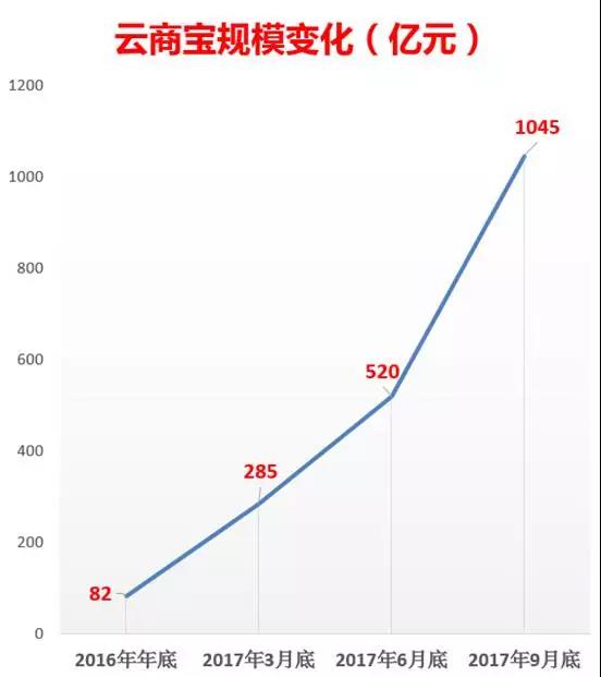 然而,马云旗下的另一个宝宝却快速增长,云商宝的规模从2017年6月底的520亿元,大幅提升到了9月底的1045亿元,短短一个季度环比增加了100%以上,比去年年底的82亿元更是增加了近12倍之多,成为天弘基金公司资产规模增长的新动力。