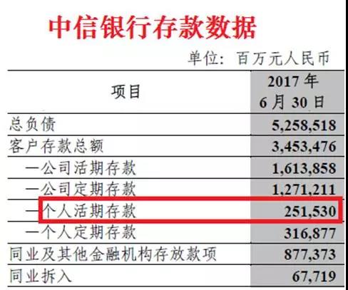 其次是中信银行的数据,该银行主要存款来自于公司客户,2017年6月30日的个人活期存款余额为2515亿元。