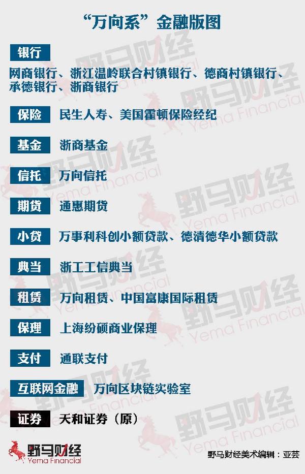 在金融领域的高举高打,使得““万向系””金融版图的扩张也异常迅速。目前为止,除了券商,其已经拥有银行、保险、基金、信托、期货等几乎全金融牌照。
