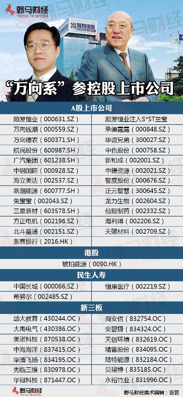 迄今为止,“万向系”至少掌握了万向钱潮(000559.SZ)、承德露露(000848.SZ)、万向德农(600371.SH)、顺发恒业(000631.SZ)等4家上市公司控制权,并参股了华谊兄弟(300027.SZ)、广汽集团(601238.SH)、新和成(002001.SZ)等18家A股、港股公司;布局有颂大教育(430244.OC)、商安信(832754.OC)等14家新三板挂牌公司;金融方面,则取得了除券商之外的几乎所有金融牌照。