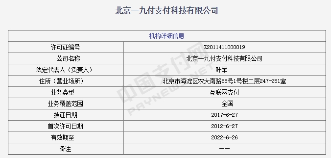 根据“支付搜”app查询结果,高阳捷迅的全资子公司一九付在2012年6月获得了互联网支付牌照。