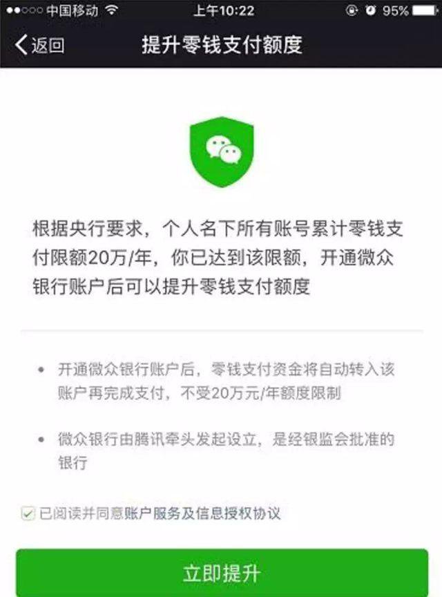 网络整理 2021-03-22 19:33去年 7 月,《非银行支付机构网络支付业务管理办法》正式实施,根据要求,在微信、支付宝等第三方支付平台上开设的个人网络支付账户,每年付款限额累计20万元。在让第三方支付回归金融中介服务商本职的同时,这项规定也搅动了整个第三方支付行业。而随着新支付业态升级,目前已有网络支付平台在这方面率先破局。近日,不少用户发现,微信支付在达到20万元最高限额后,可通过开通微众银行账号提升支付额度,不受20万元/年额度限制。