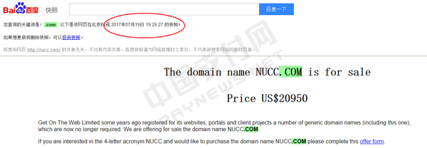 在此之前,网联通过域名交易获得了nucc.com的所有权。中国支付网获得的百度快照信息显示,彼时该域名卖家叫价20950美元,等价于约13.7万元人民币。