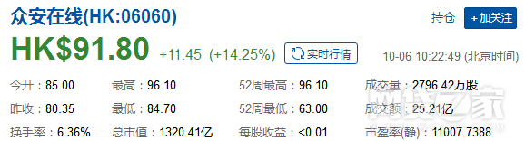 牛!众安保险再涨14% 市值突破1300亿港元