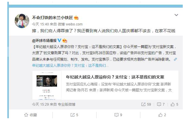 @饭统戴老板:支付宝的新文案:“年纪越大,越没有人会原谅你的穷!”一堆负能量,满屏焦虑感。这年头,穷人除了自己生活窘迫之外,还得乞求原谅?另外,鼓励穷人把仅有的积蓄拿去进入股票市场,并不做风险提示,恐怕并不能“给生活多一次机会”吧。总结:丧格满分,文案高分,情怀零分,良心负分。