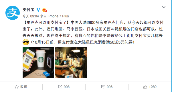 转载请标注:信息网——支付宝成功勾搭星巴克 国内千家门店可扫码付