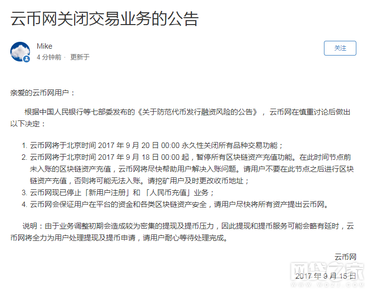 云币网将于北京时间2017 年9 月20 日00:00 永久性关闭所有品种交易功能;