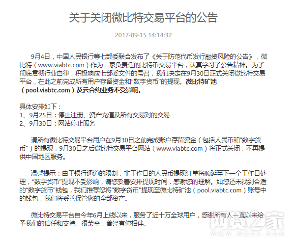 请所有微比特交易平台用户在9月30日之前完成账户存留资金(包括人民币和“数字货币”)的提现,9月30日之后微比特交易平台网站(www.viabtc.com)将正式关闭,不再提供中国地区服务。