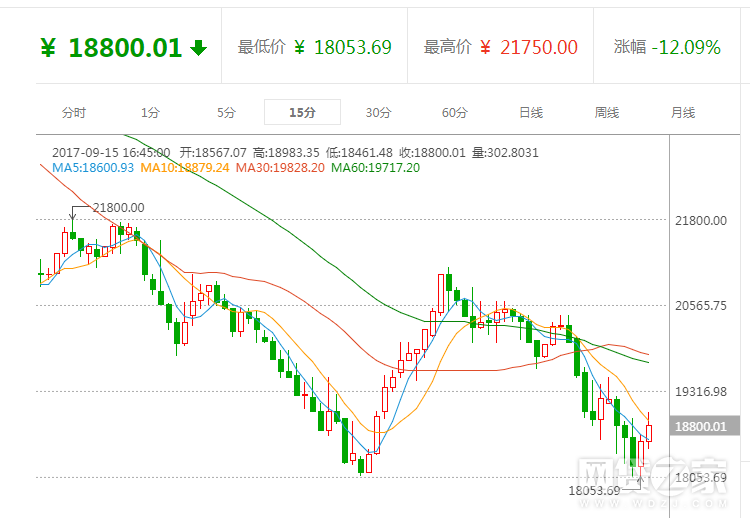 目前,火币网行情数据显示,人民币计比特币价格目前报于18800元附近,跌幅超12%,此前一度跌至18053.69元的日间新低。