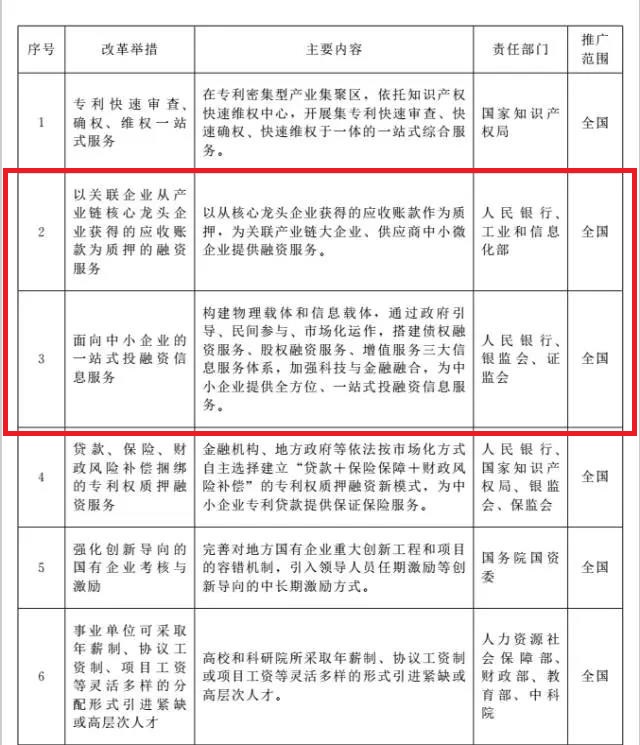 一是科技金融创新方面,推广“以关联企业从产业链核心龙头企业获得的应收账款为质押的融资服务”、“面向中小企业的一站式投融资信息服务”、“贷款、保险、财政风险补偿捆绑的专利权质押融资服务”等3项改革举措,进一步创新政府引导、民间参与、市场化运作支持企业融资的服务模式,拓展科技型企业的融资渠道,提高金融支持创新的灵活性和便利性,发挥金融工具的助推作用。