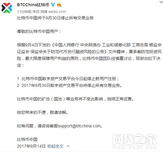 随后,比特币中国9月14日晚间在其官方微博发布公告称,比特币中国数字资产交易平台将从今日起停止新用户注册;2017年9月30日数字资产交易平台将停止所有交易业务。公开资料显示,比特币中国是中国运营最久的比特币交易平台,成立于2011年6月9日。目前中国前五大比特币交易所为OKCoin、火币网、BTCC、CHBTC、BTCtrade,其余平台暂未表态。