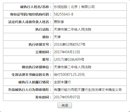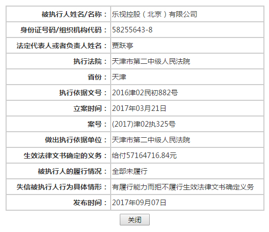 其中,乐视控股(北京)有限公司所涉及的案件有两起,案号分别是,(2017)津02执409号和(2017)津02执325号,执行法院均为天津市第二中级人民法院,生效法律文书确定的义务为给付5008.7125万元和5716.4716万元,合计约1.07亿元。