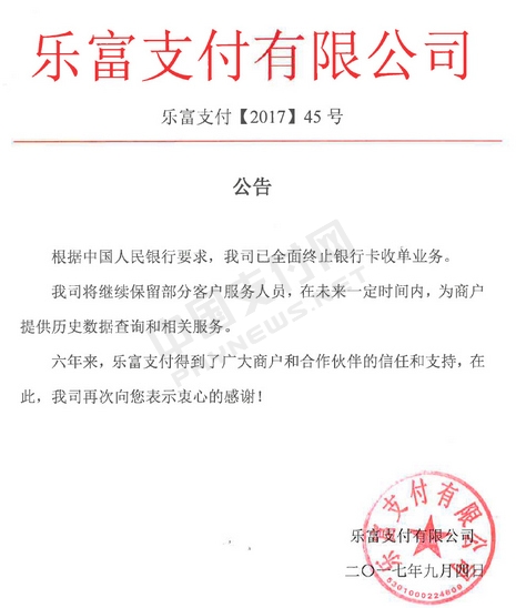9月4日,乐富发出公告,称已经全面终止收单业务。