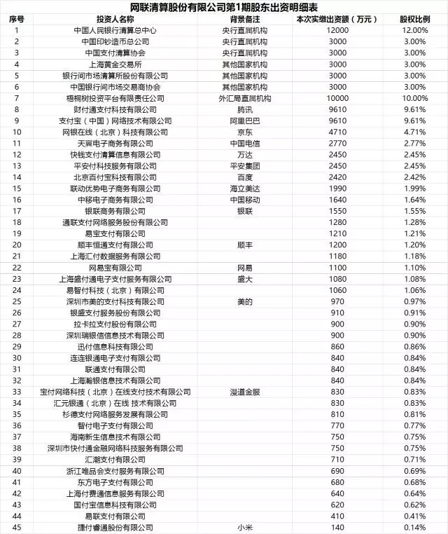 工商资料显示,与之前网上流传的股东名单相同,网联清算有限公司共有45名股东。据此前公开报道,网联第一大股东为中国人民银行清算总中心,持股比例12%。包括人民银行、外汇管理局在内的“国家队”合计持股37%。
