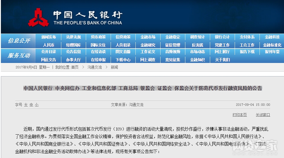 网络整理 2021-03-22 19:59网贷之家讯 9月4日,央行官网发布“中国人民银行 中央网信办 工业和信息化部 工商总局 银监会 证监会 保监会关于防范代币发行融资风险的公告”(下文简称公告),称国内ICO(首次代币发行)融资大量涌现,投机炒作盛行,涉嫌从事非法金融活动,严重扰乱了经济金融秩序。