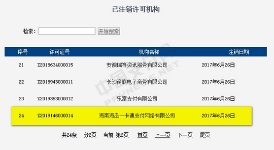 央行网站昨日正式注销了一张支付牌照,即海南海岛一卡通支付网络有限公司,因其在第三批支付牌照续展中被国付宝合并。