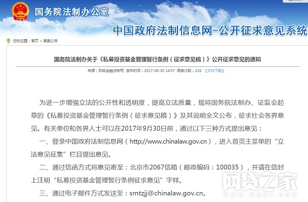 网络整理 2021-03-22 20:04网贷之家讯 8月30日,国务院法制办官方发布关于《私募投资基金管理暂行条例(征求意见稿)》(下文简称“征求意见稿”)公开征求意见的通知,就征求意见稿向社会各界公开征求意见,截止时间为2017年9月30日。
