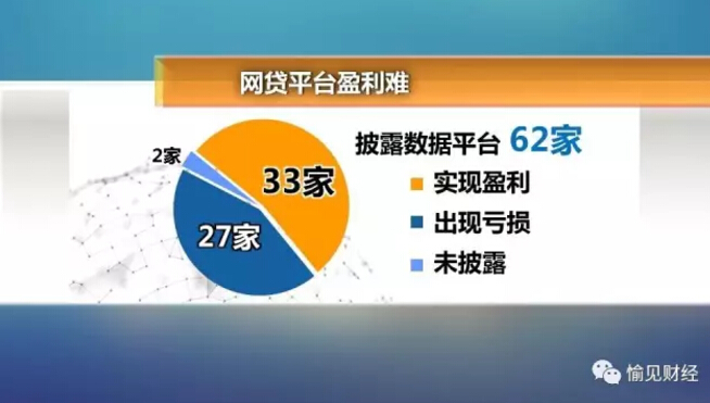 我查了中国互联网金融协会信息平台上的62家网贷机构最新披露的经营数据,其中33家盈利、两家未披露盈利情况、27家公司是亏损的。这里必须要说明的是,能首批接入信息披露平台的公司,还都是行业里的佼佼者、优等生,也就是整个行业里最好的公司们都有将近一般是在亏损的。可以想见除了他们之外,这个行业的亏损面很可能更大。