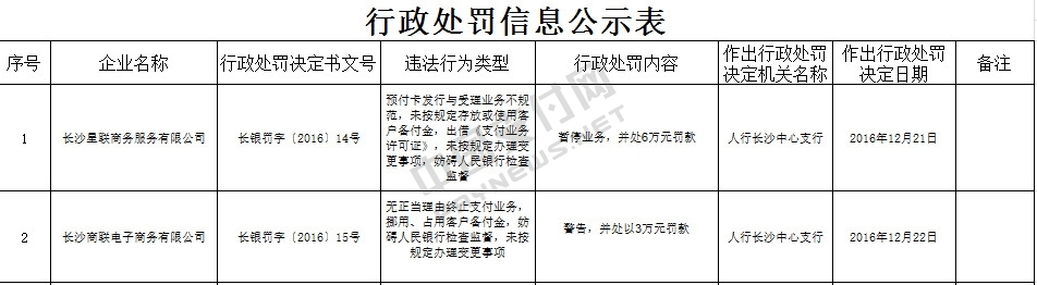 2016年12月21日,长沙星联商务服务有限公司因“预付卡发行与受理业务不规范,未按规定存放或使用客户备付金,出借《支付业务许可证》,未按规定办理变更事项,妨碍人民银行检查监督”,被给予“暂停业务,并处6万元罚款”的处罚。
