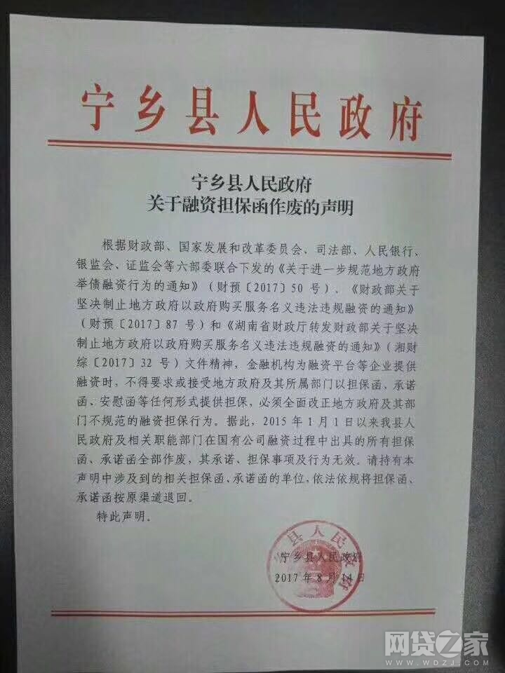 网络整理 2021-03-22 20:088月23日,网上流传一份宁乡县人民政府关于融资担保函作废的声明刷屏朋友圈,与以往撤函不同的是,这次地方政府撤函显得简单粗暴,直接宣布所有担保函、承诺函全部作废。《华夏时报》记者从与相关机构处证实了此函的真实性。