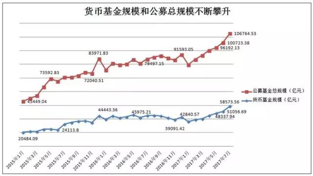 数据显示,截至2017年7月底,货币基金总规模为5.86万亿元,再创历史新高,这一数据环比6月底大增7516.87亿元,增幅为14.72%。而从今年来看,这一数据已经是连续6个月净增长,比去年底货基规模已经增长1.57万亿元,今年以来货币规模增幅已经高达36.72%。