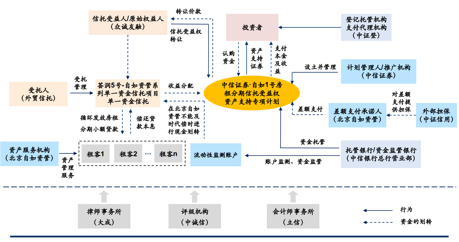 第一财经了解到,“自如1号”原始权益人为北京自如众诚友融信息科技有限公司,计划管理人为中信证券,信托计划受托人为中国对外经济贸易信托有限公司,差额支付承诺人为北京自如资产管理有限公司。北京自如资产管理有限公司成立于2015年10月,是链家集团内自如业务体系的控股平台。截至2016年末,北京自如资管已经成长为国内最大的品牌公寓管理和运营企业。