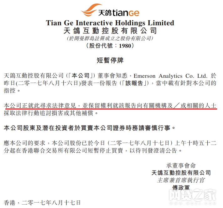 报告致其股价早间下跌7.78%并紧急宣布停牌,天鸽互动方面回应称,公司财务真实,没有问题,报告内容纯属无稽之谈。