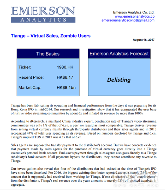 网络整理 2021-03-22 20:13网贷之家综合 8月17日早间,沽空机构爱默生(Emerson)发表针对港股上市公司天鸽互动(01980.HK)的做空报告,称其存在重大欺诈行为,唯一适当的监管行动是退市。