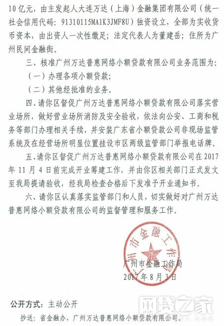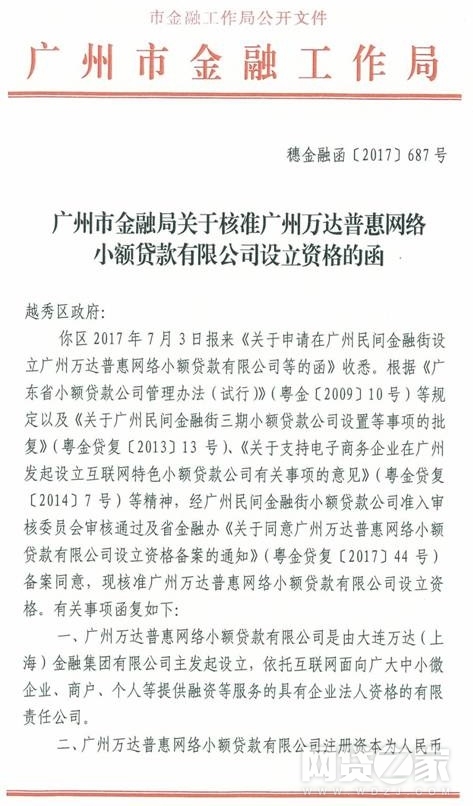 网络整理 2021-03-22 20:17网贷之家讯 8月14日,据广东省金融办官网披露的消息称,7月31日,广东省金融办已同意广州万达普惠网络小额贷款有限公司(下文简称“广州万达网络小贷”)设立资格备案。