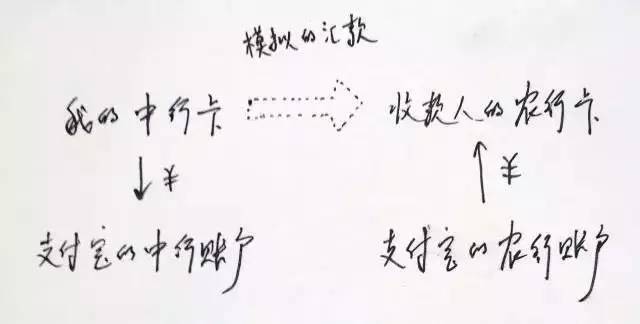 比如,我用支付宝做一次跨行转账,从中行向收款人(可以是自己)的农行汇款。那么,只要从我的中行卡转到支付宝开在中行的账户,然后支付宝再把它存在农行的钱,汇至收款人的农行账户上。以此,支付宝用两笔同行转账,“模拟”了一次跨行汇款(下图虚线部分),用不着央行的清算账户。
