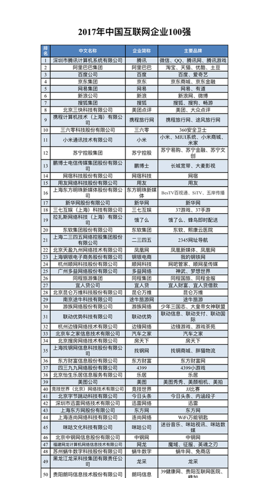 网络整理 2021-03-22 20:253日,中国互联网协会、工业和信息化部信息中心在京联合发布了2017年“中国互联网企业100强”榜单。